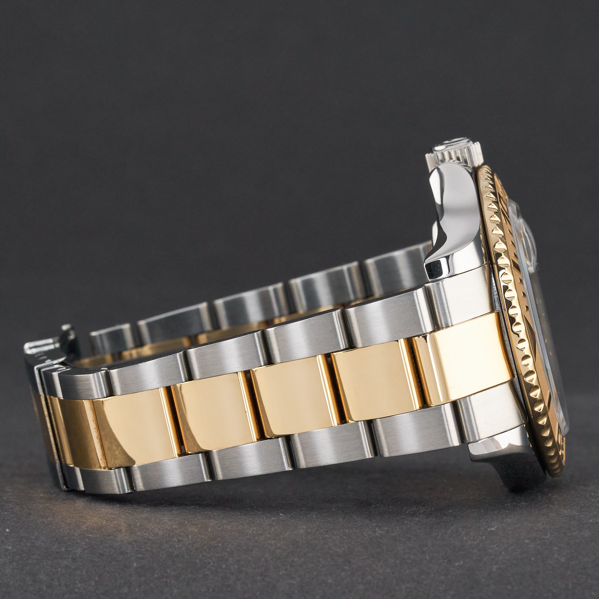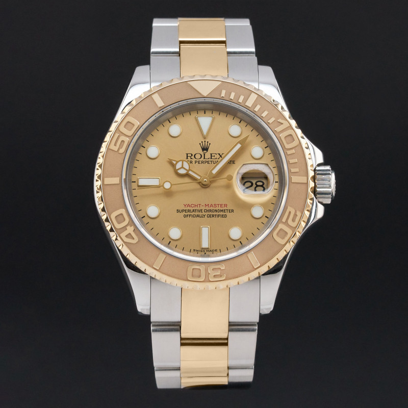 This Rolex Yacht-Master 16623 features a Champagne dial and is crafted from 18K yellow gold and stainless steel, with a production year of 2006.