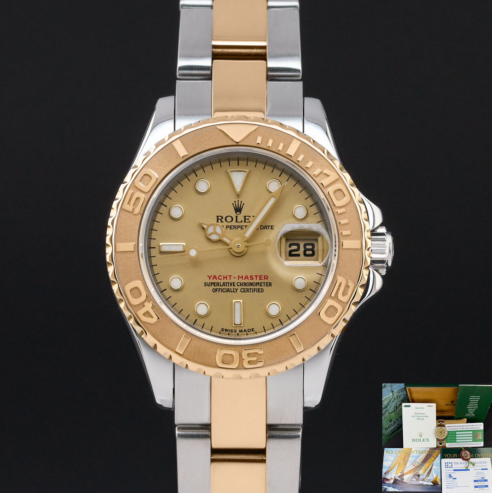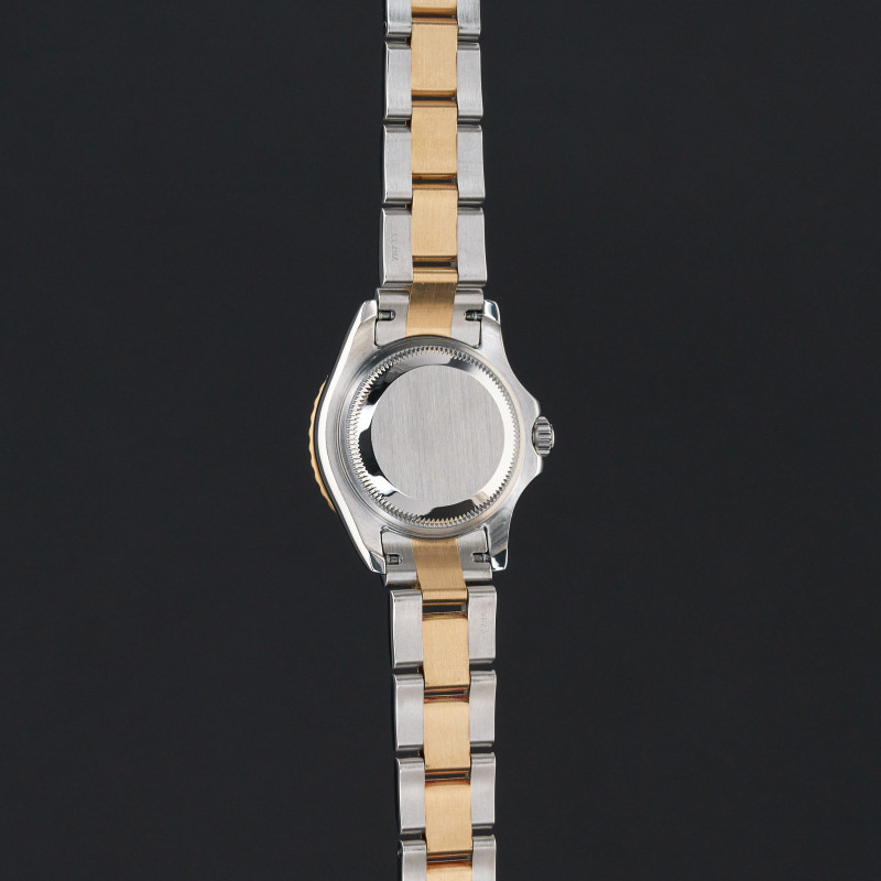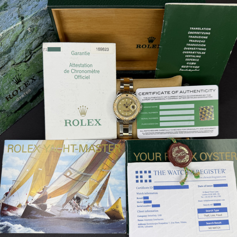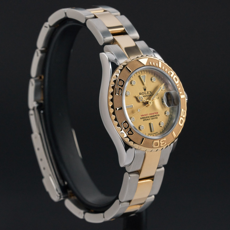 This Rolex Yacht-Master 169623 features a Champagne dial and is crafted from 18K yellow gold and stainless steel, with a production year of 2002.