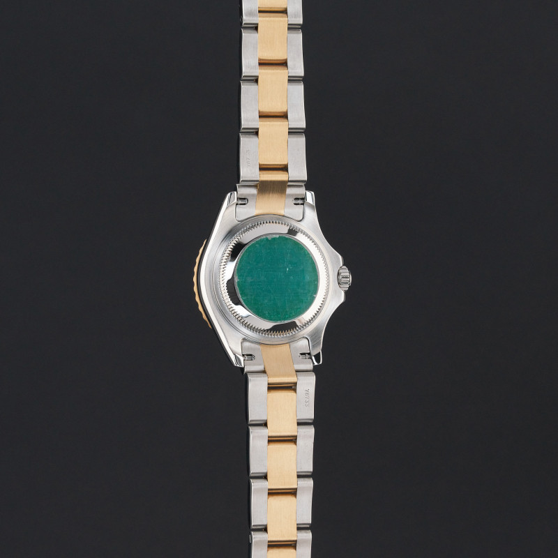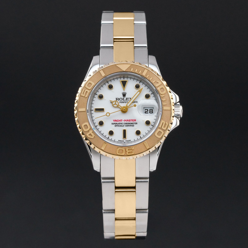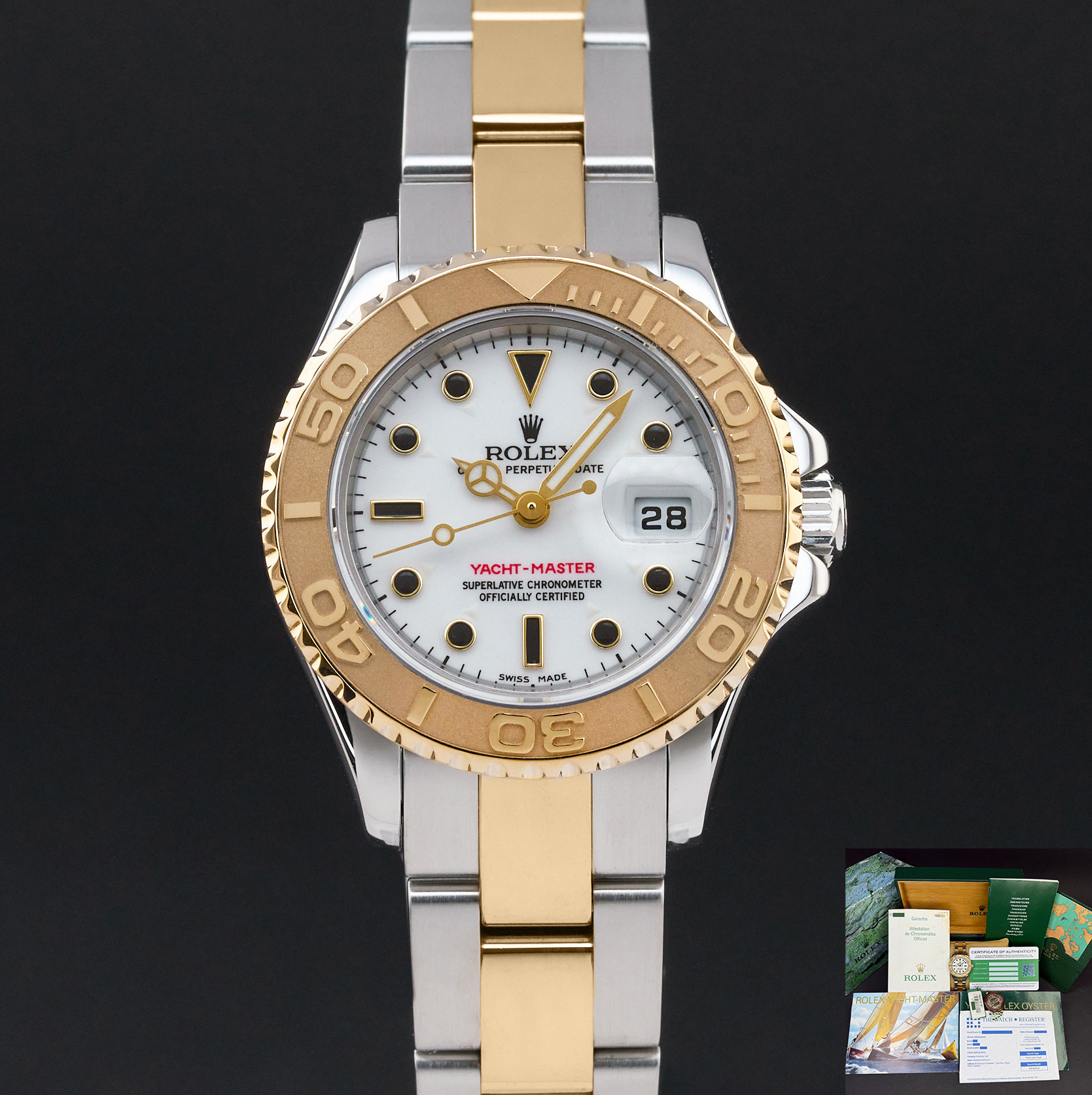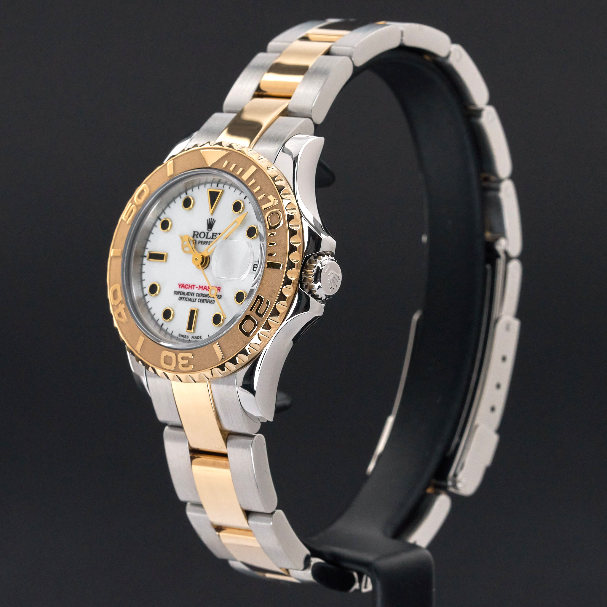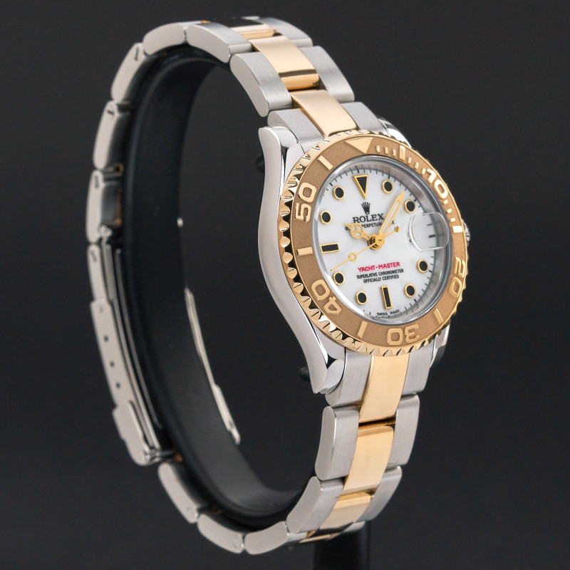 This Rolex Yacht-Master 169623 features a White dial and is crafted from 18K yellow gold and stainless steel, with a production year of 2002.