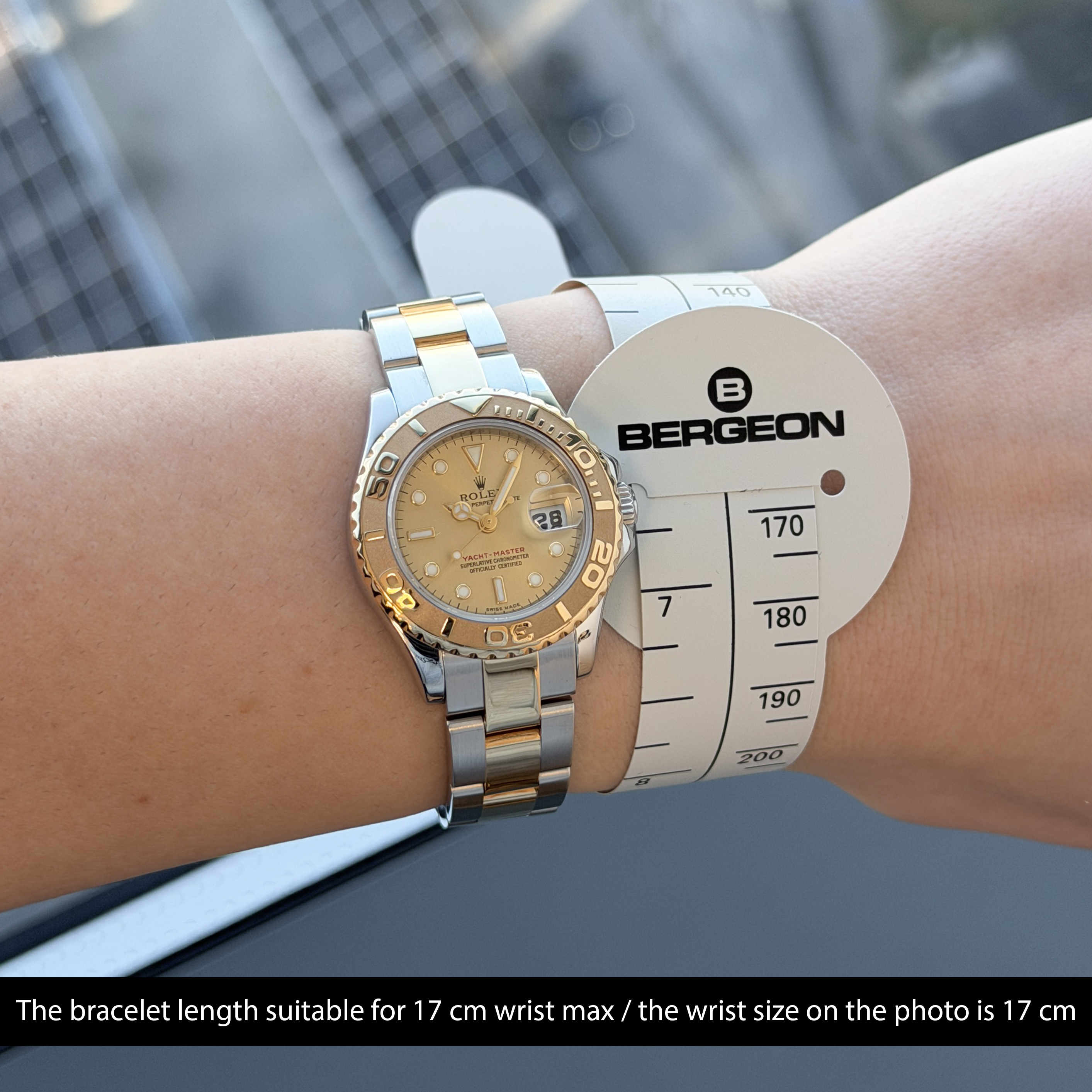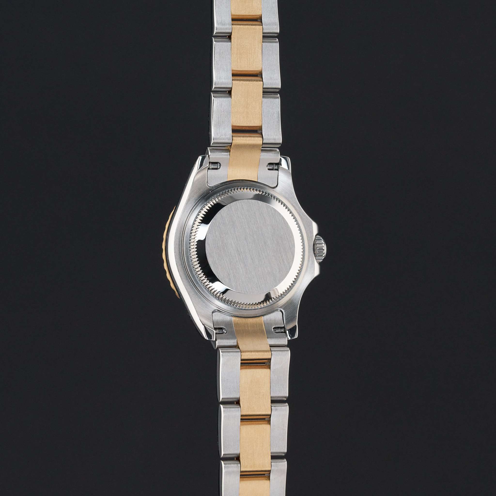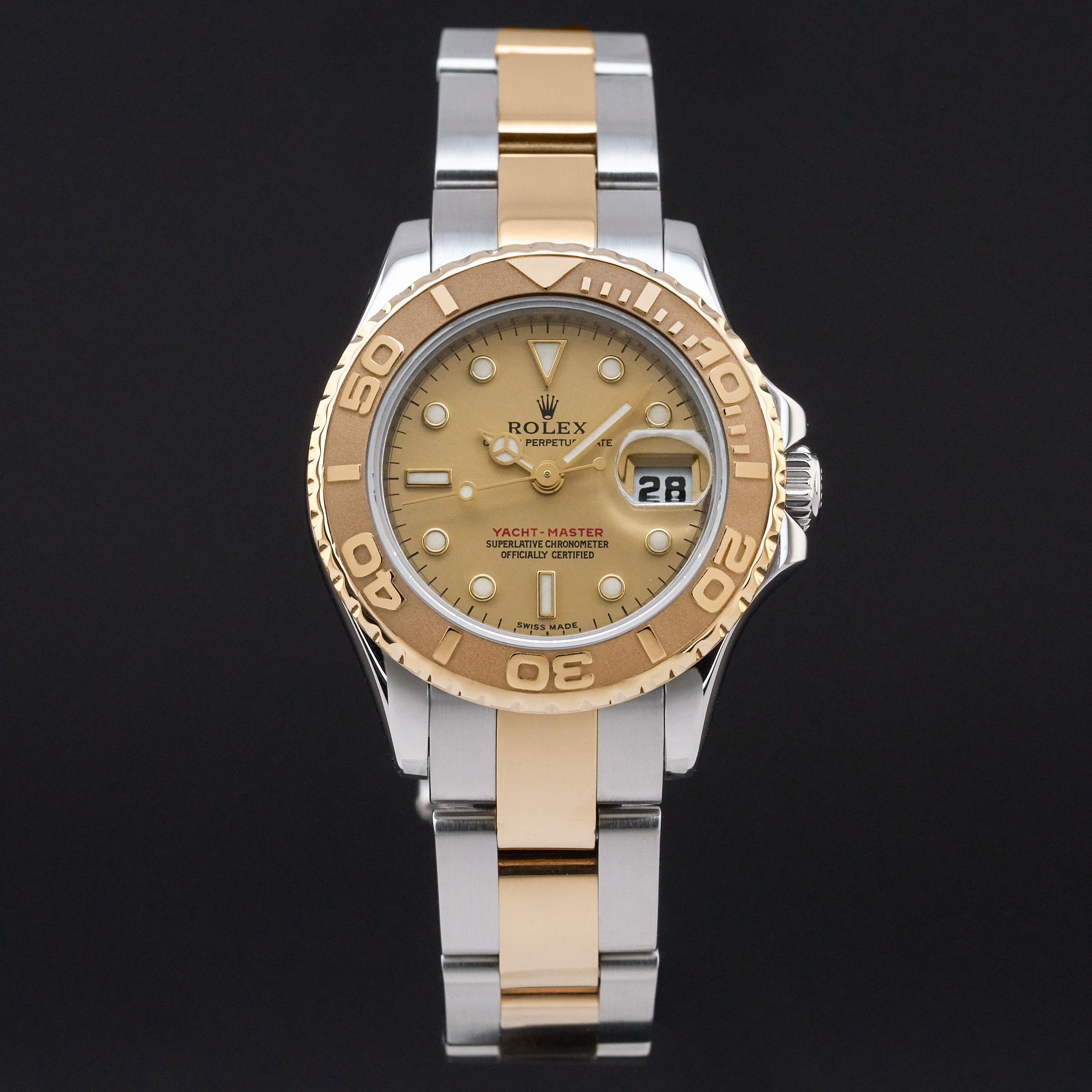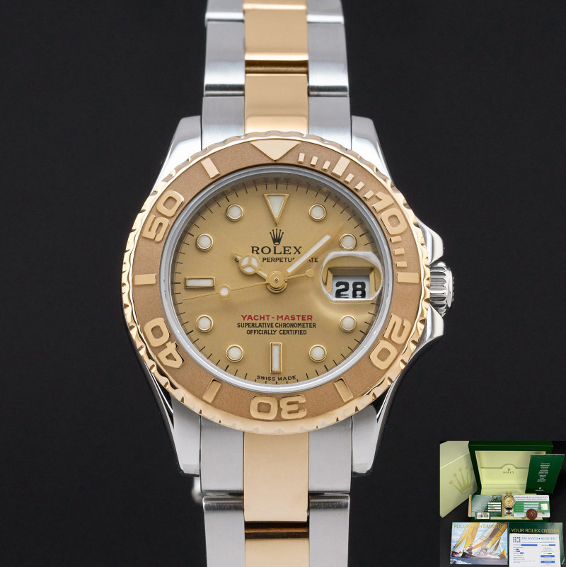 This Rolex Yacht-Master 169623 features a Champagne dial and is crafted from 18K yellow gold and stainless steel, with a production year of 2008.