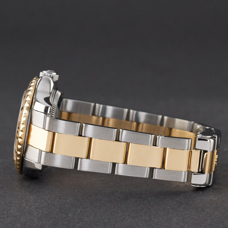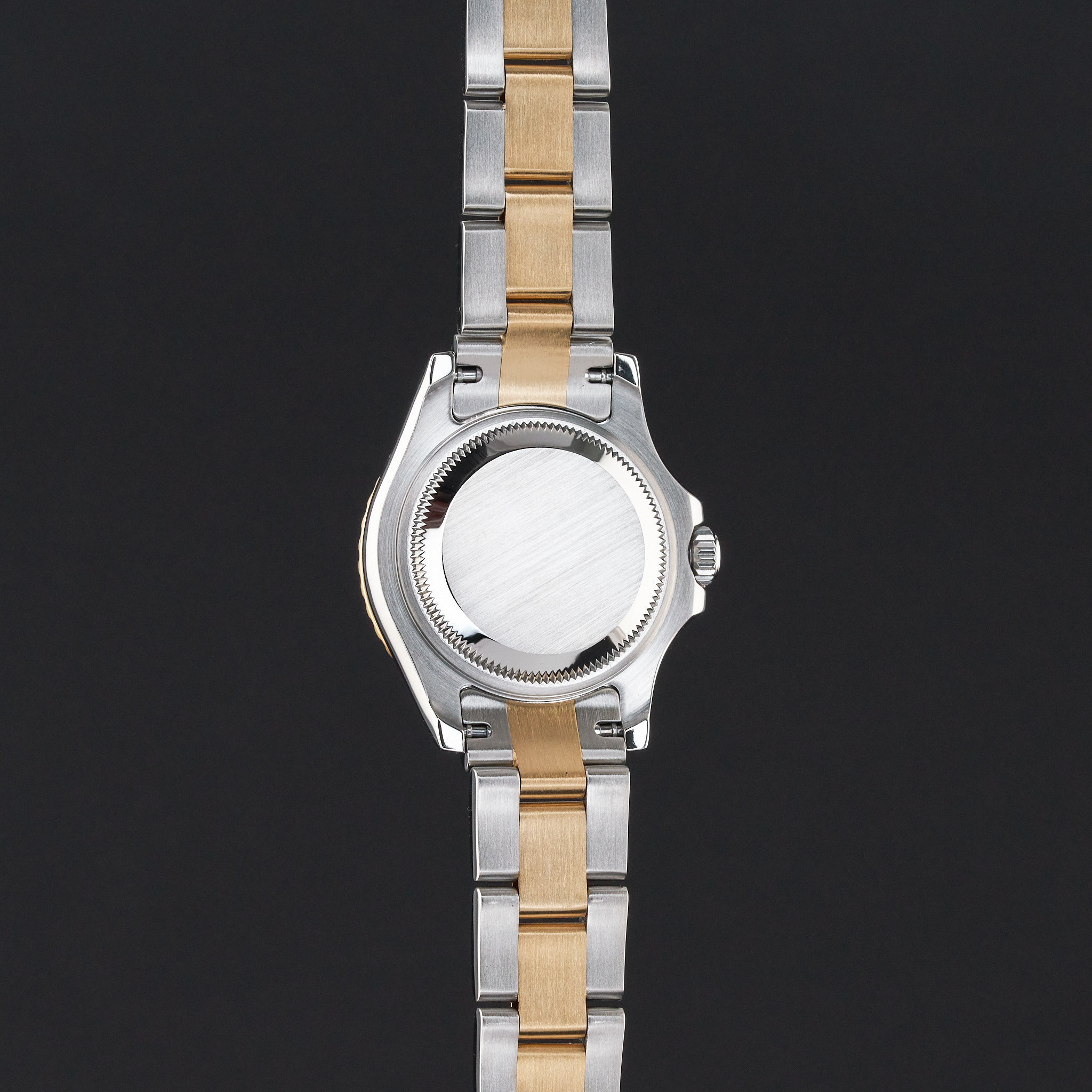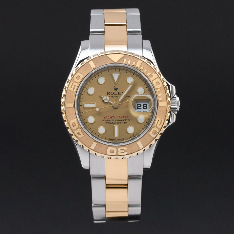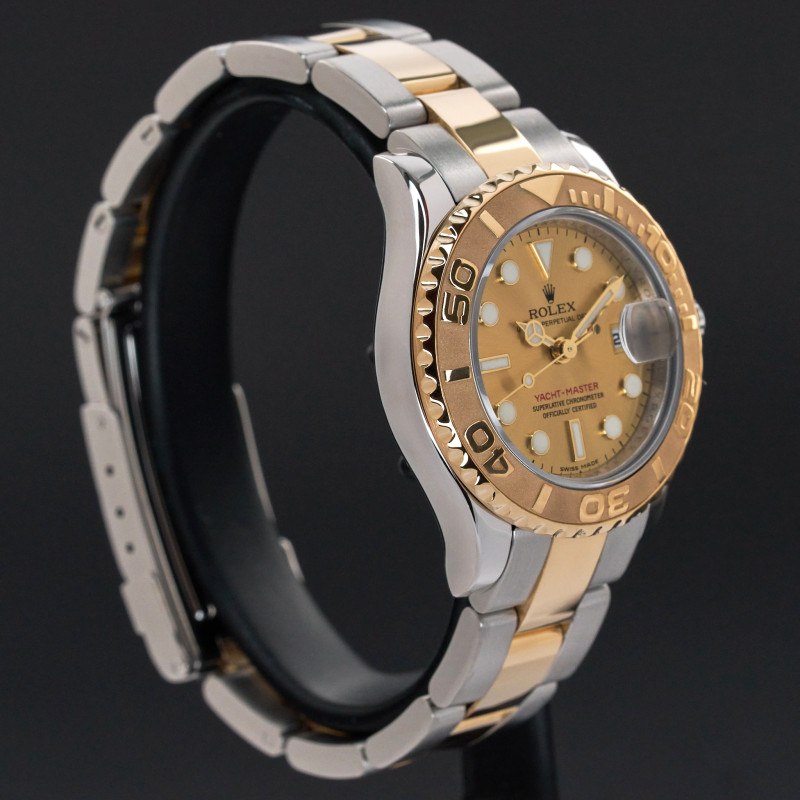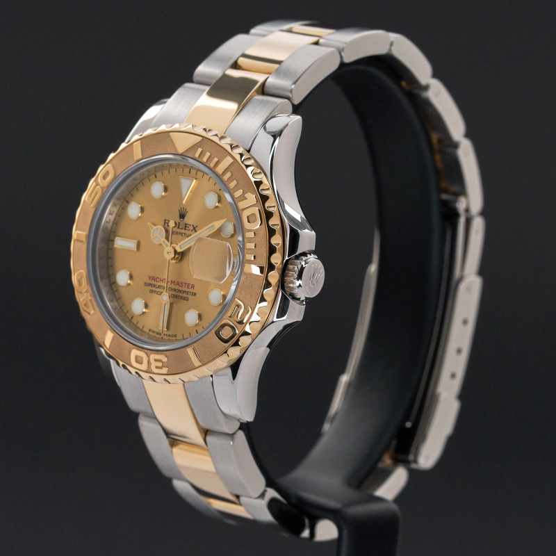 This Rolex Yacht-Master 169623 features a Champagne dial and is crafted from 18K yellow gold and stainless steel, with a production year of 2009.