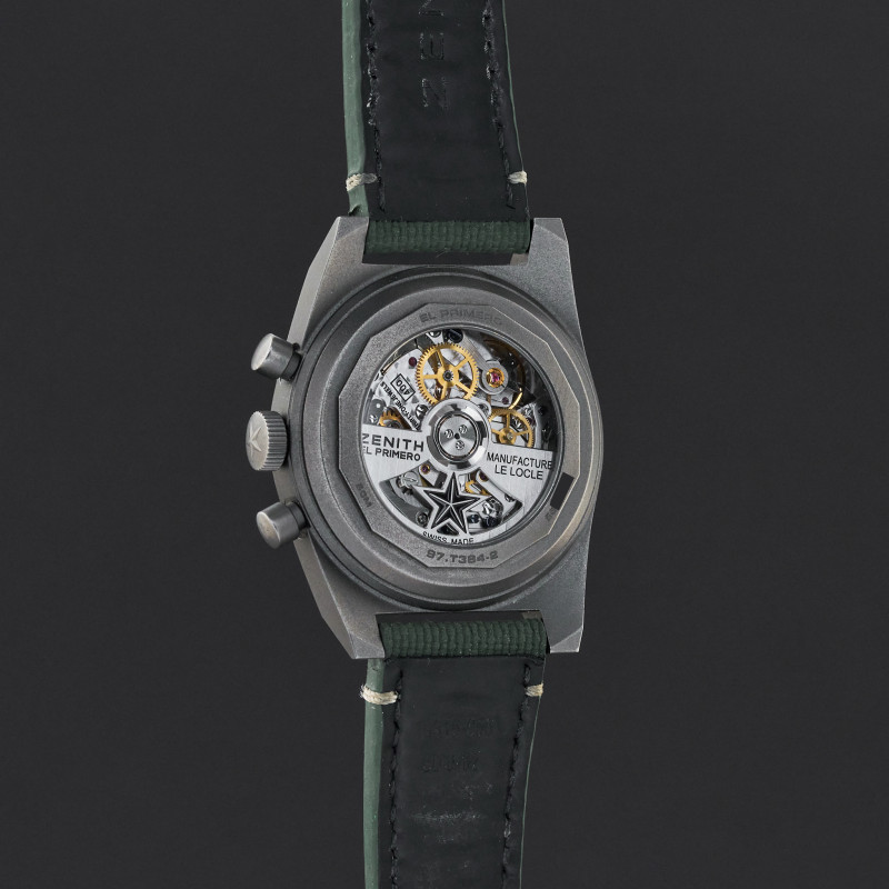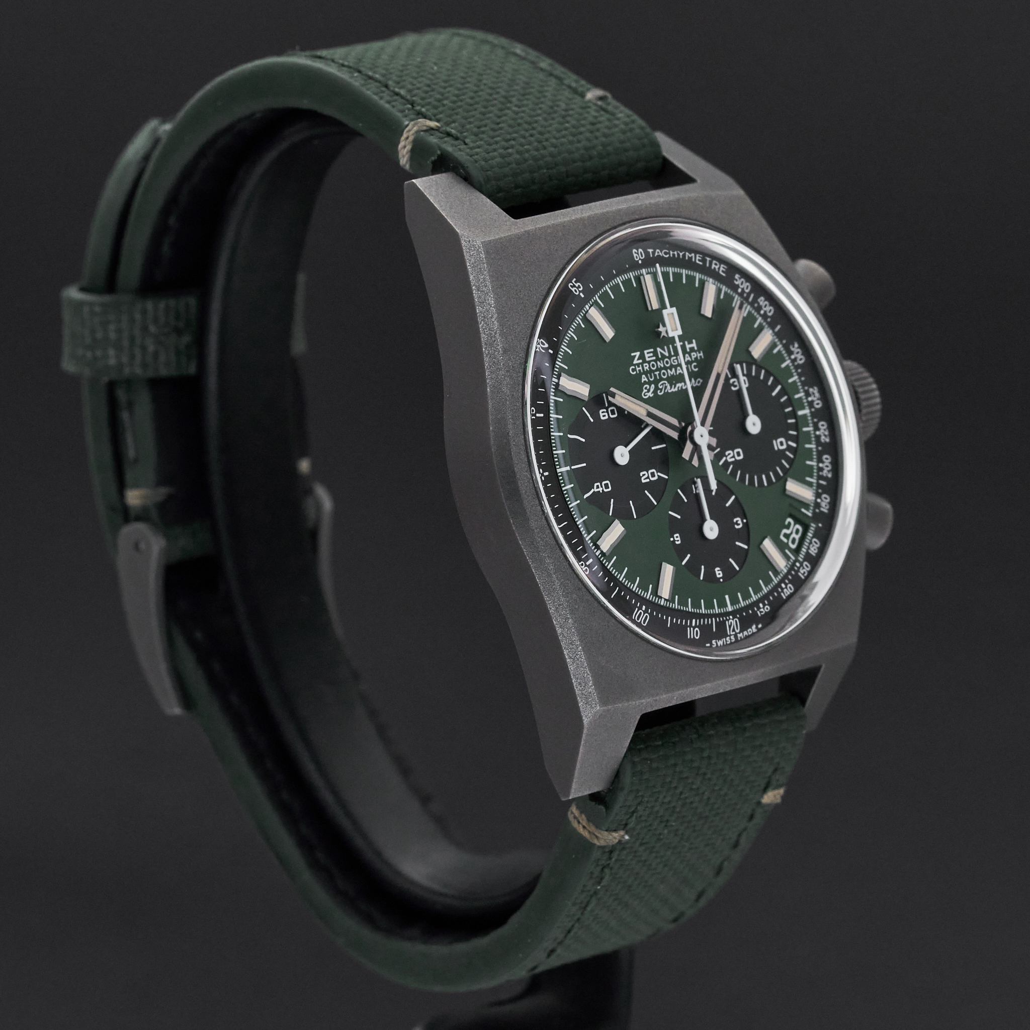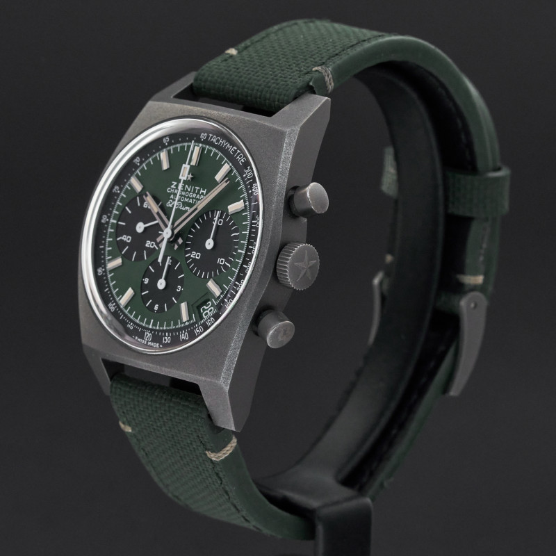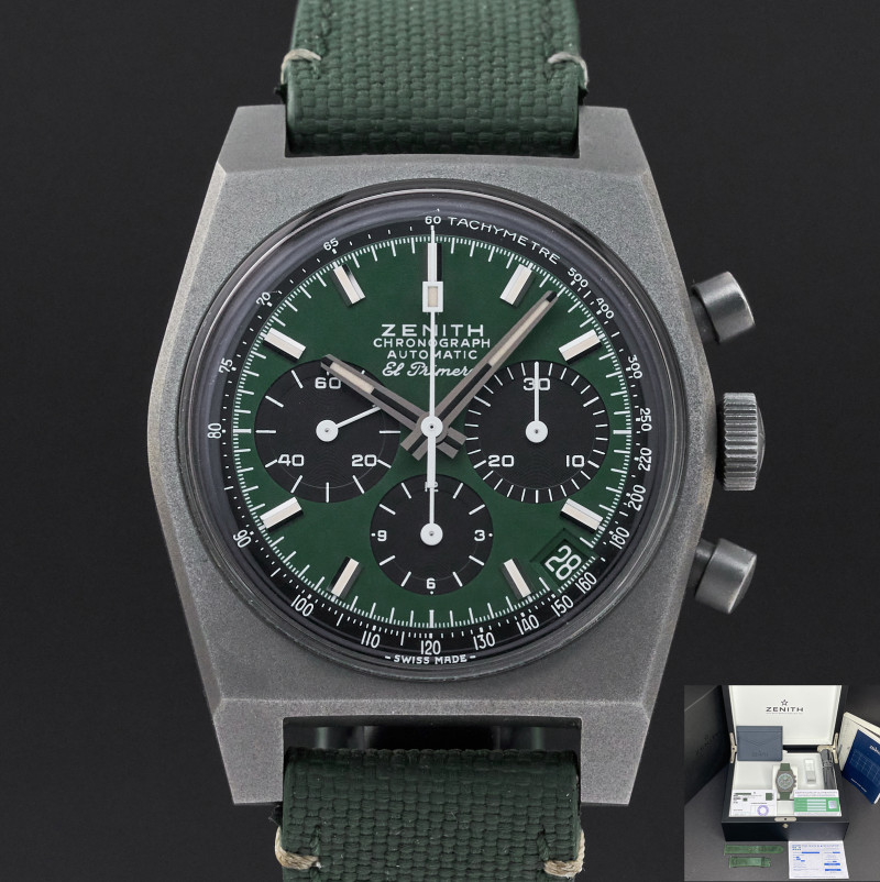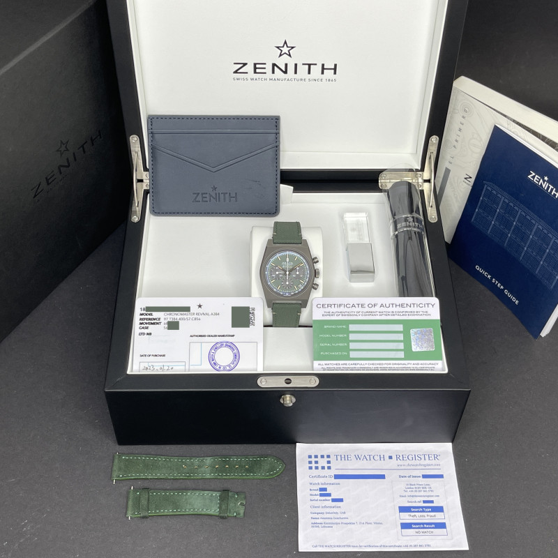This Zenith Chronomaster Revival Safari 97.T384.400/57.C856 features a Green dial and is crafted from titanium, with a production year of 2023.