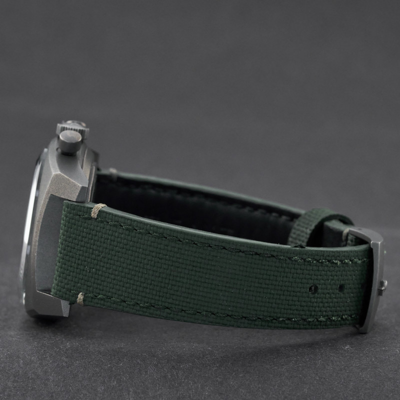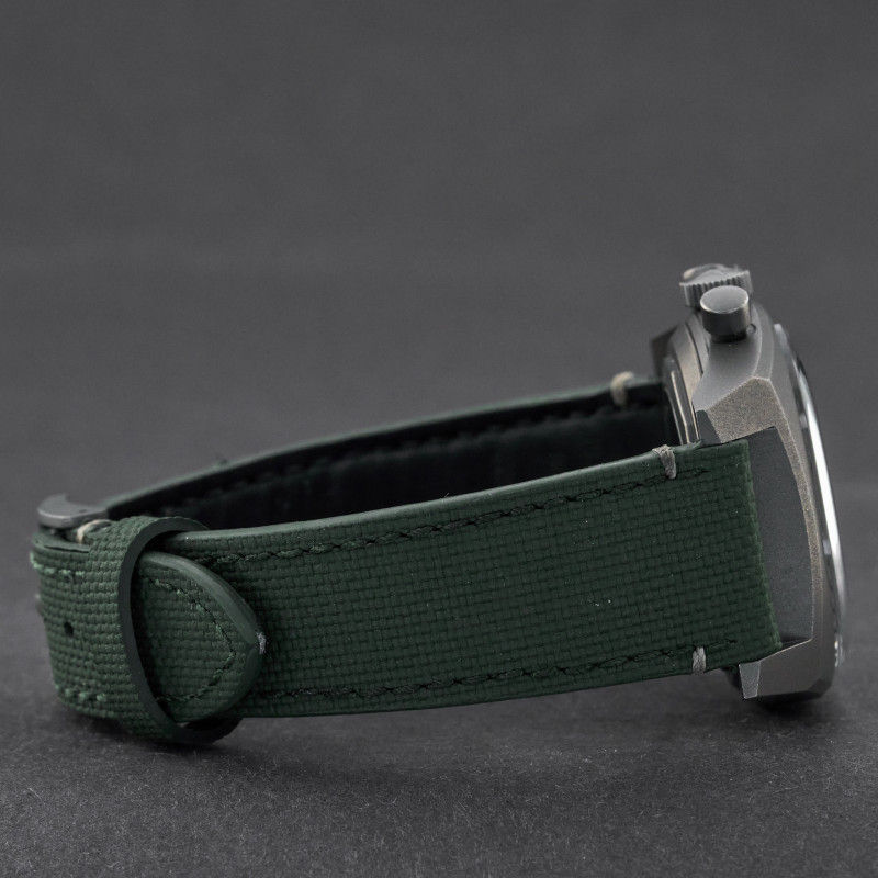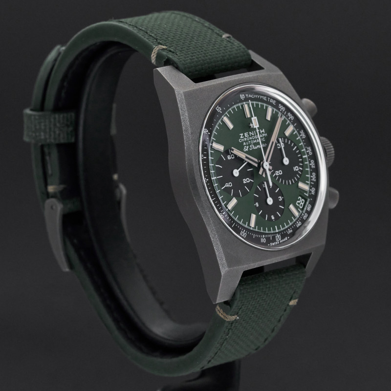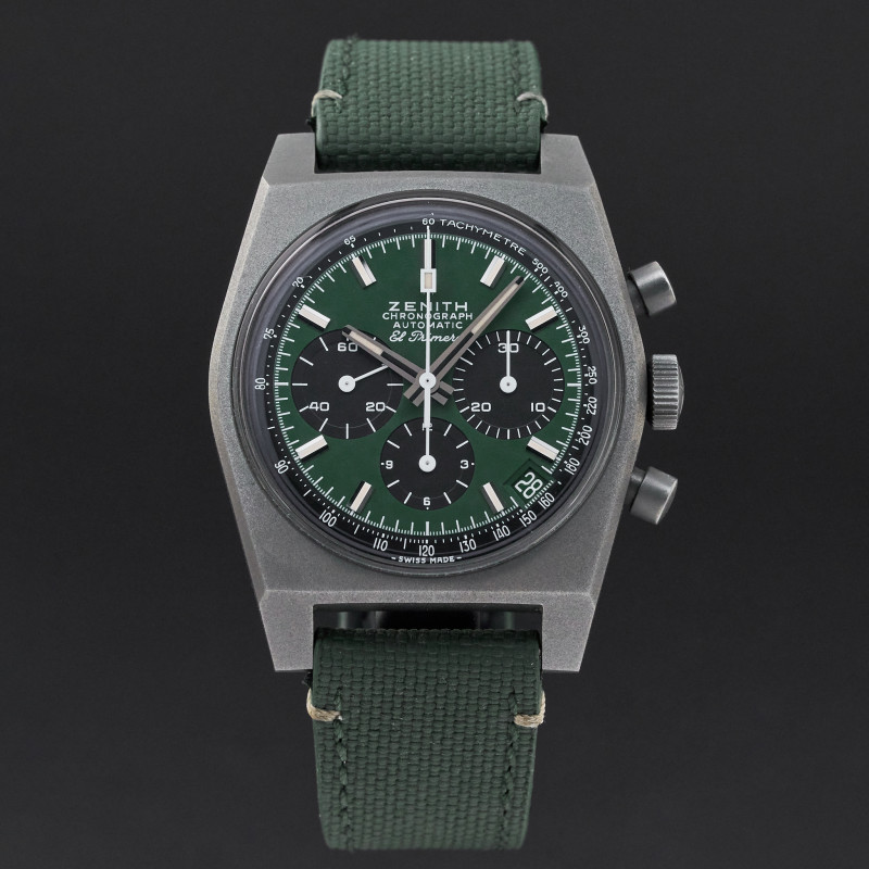 This particular Zenith Chronomaster Revival Safari introduced in 2023, is a bold reinterpretation of the brand’s iconic A384 chronograph. It's matte green dial adds a contemporary edge, while the tonneau-shaped case and classic El Primero chronograph layout pay homage to the 1969 original. The textured microblasted titanium case gives the watch a stealthy, utilitarian character – perfectly matched by the rugged green cordura strap.