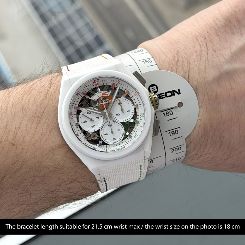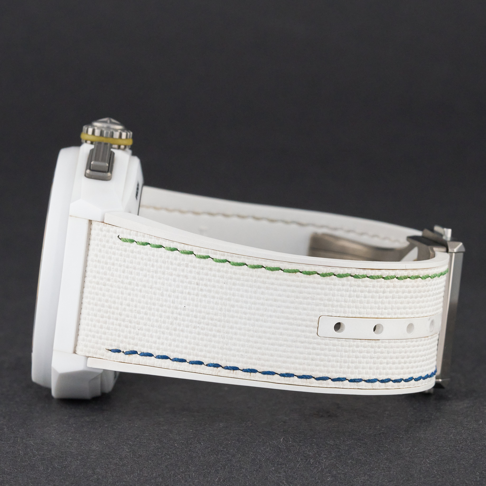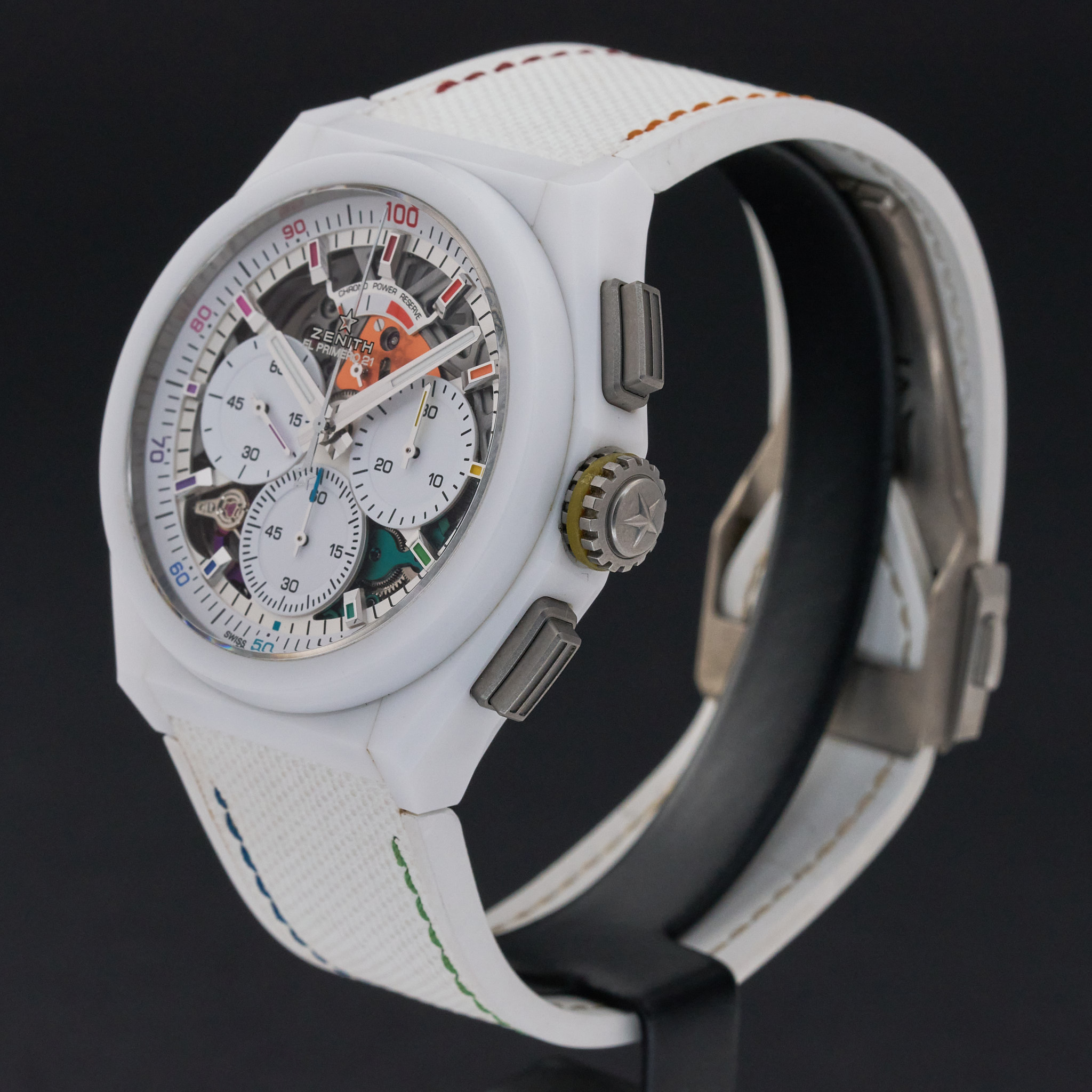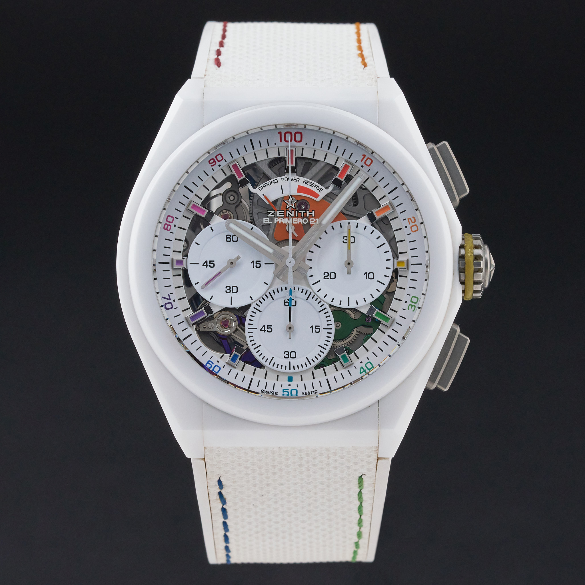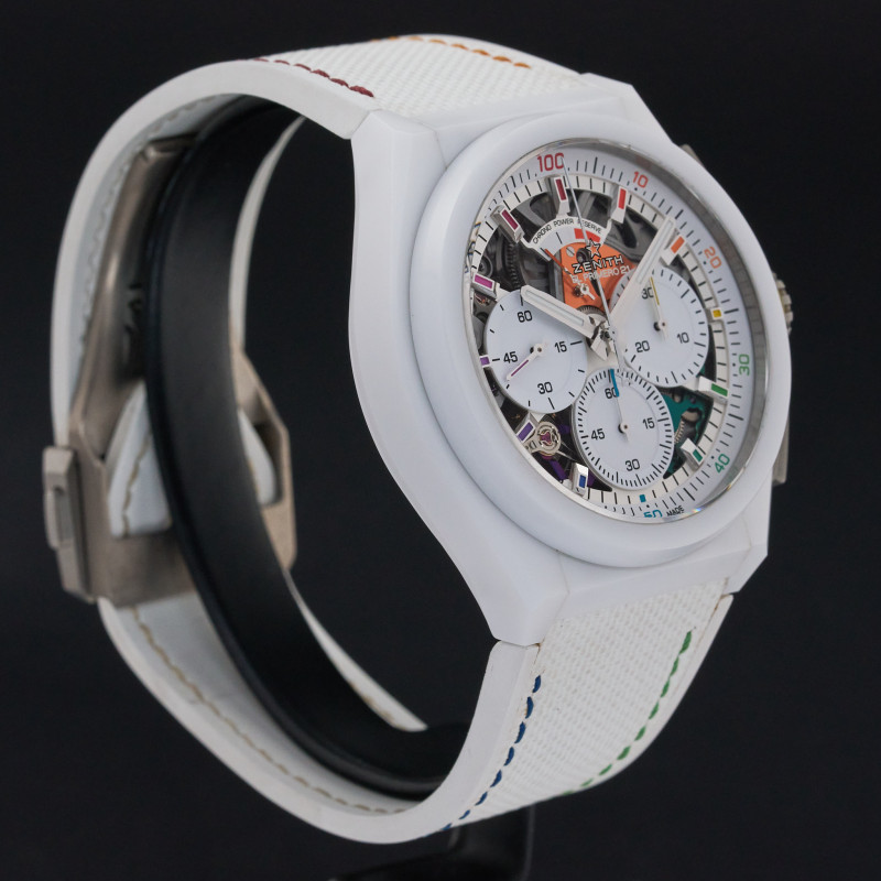 This Zenith Defy 21 Chroma El Primero Limited Edition 49.9010.9004/01.R947 features a White rainbow dial and is crafted from matte white ceramic and titanium, with a production year of 2022.