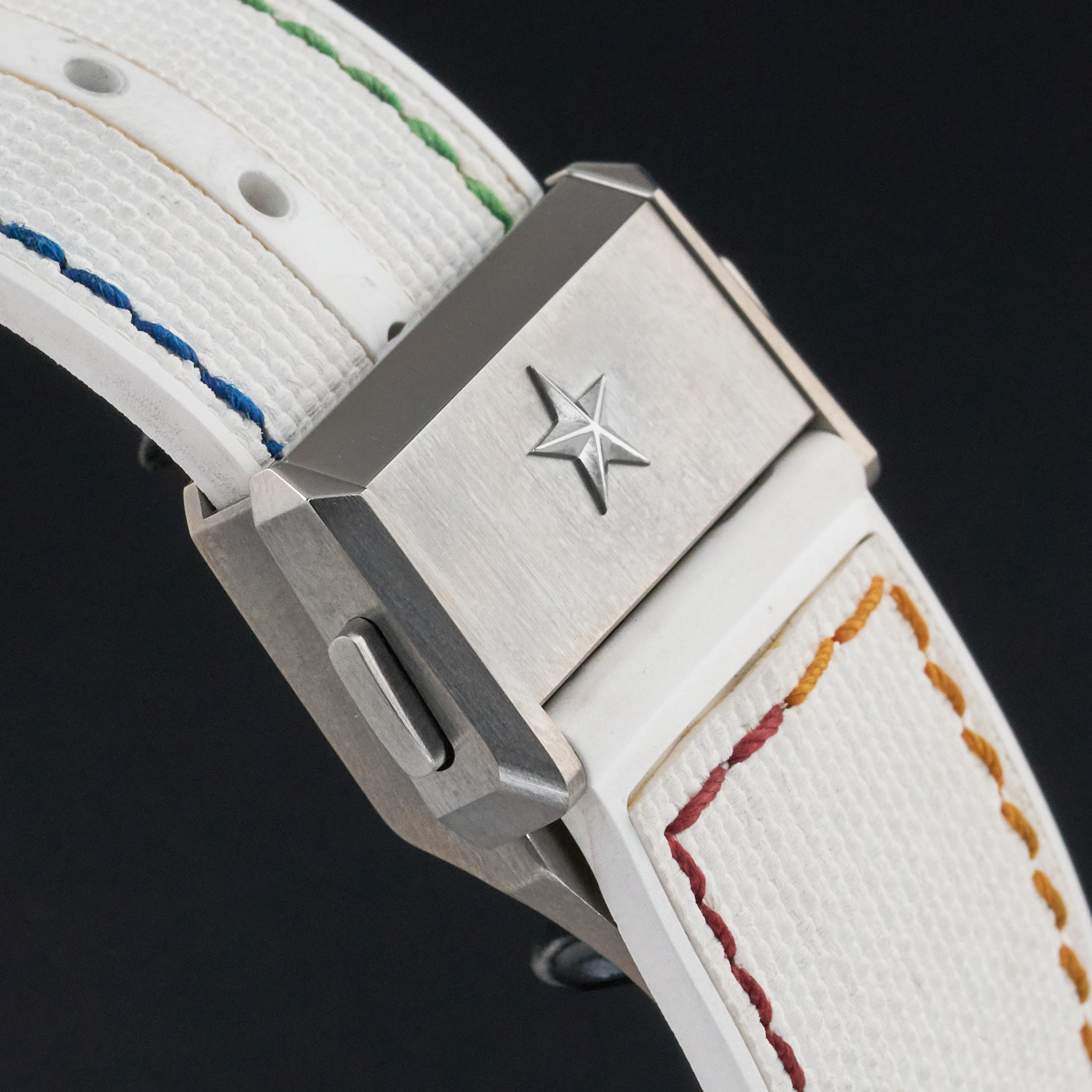This particular Zenith Defy 21 Chroma El Primero introduced in 2022, is a bold limited edition timepiece, combining technical mastery with vivid design. Its clean white dial serves as the perfect canvas for the striking rainbow-set gemstones, creating a dynamic contrast of color and light. The result is a watch that feels both playful and exceptionally refined.