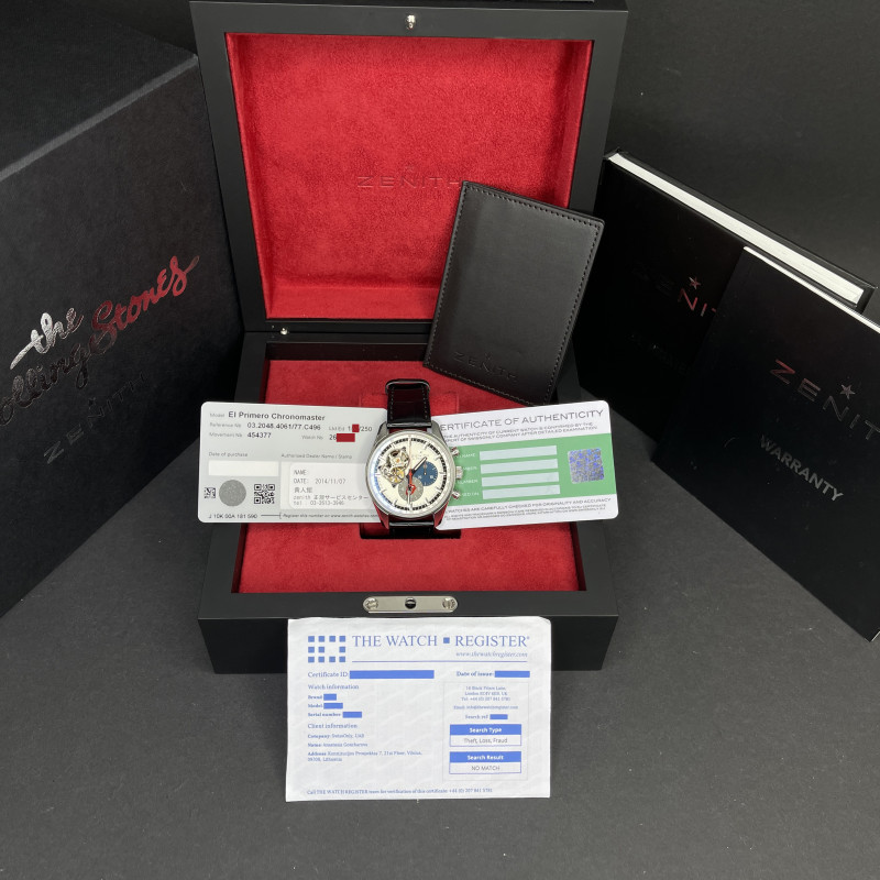 This Zenith El Primero Chronomaster The Rolling Stones Limited Edition 03.2048.4061/77.C496 features a Silver dial and is crafted from stainless steel, with a production year of 2014.