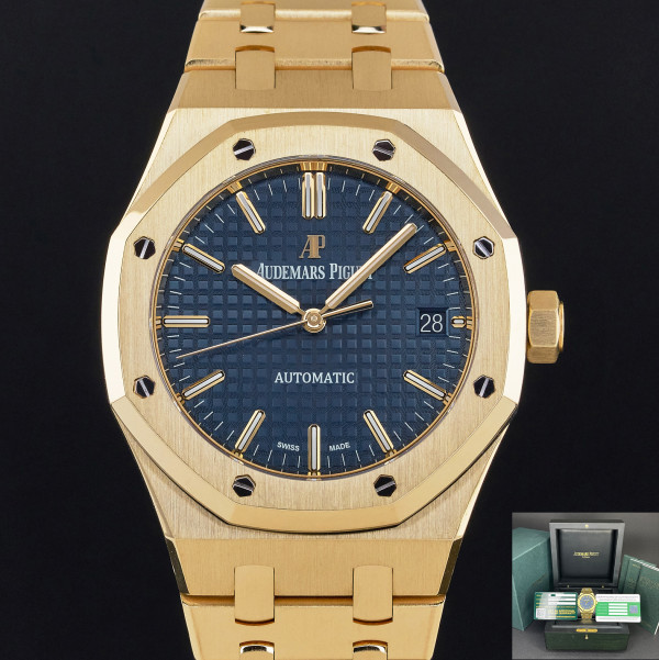 Audemars Piguet Royal Oak, 15450BA, 37mm, 2018, Yellow gold, Blue Grande Tapisserie dial, Fullset, 1y warranty